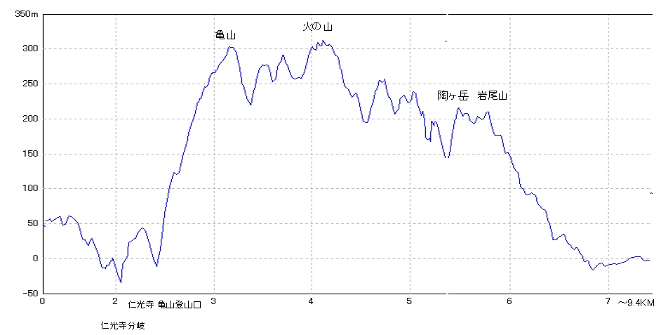 ルート 第五セミナーパーク駐車場→仁光寺登山口 →亀山→火の山→陶ヶ岳→岩屋山→