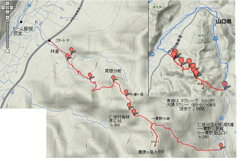仁保重石コース(初めて)→小麦ヶ岳→蕎麦ヶ岳 / 蕎麦ヶ岳→一貫野コース分岐→一貫野登山口→ タク シー→駐車地