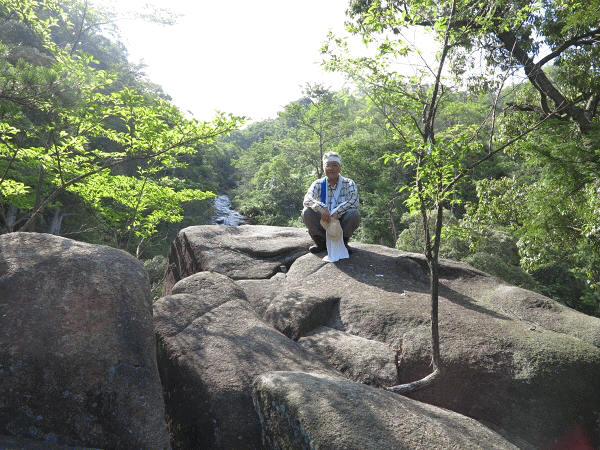 重石の上(高さ約30m)から見るナメ滝(長さ300m、落差70〜80m)は 県内では見られない渓谷美をなしています。こんな素晴らしい滝が喧伝されてないのに不思議に思います。ものの本によりますと ここの周辺は松茸の産地であまりPRしないそうです。しかし時と自然環境が変わり、今でも産地なのかどうか、疑わしいところです。