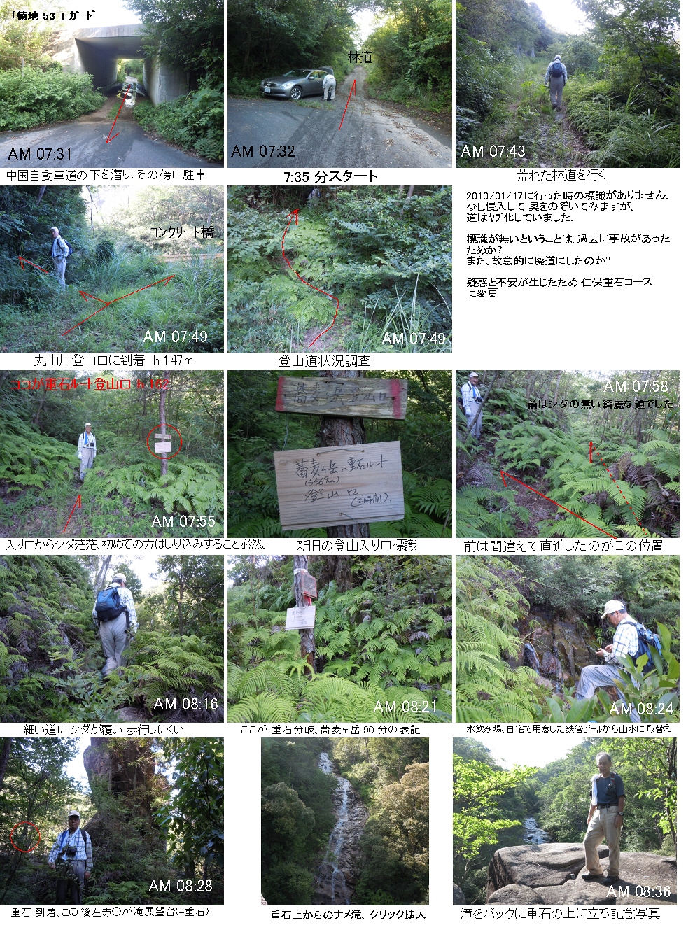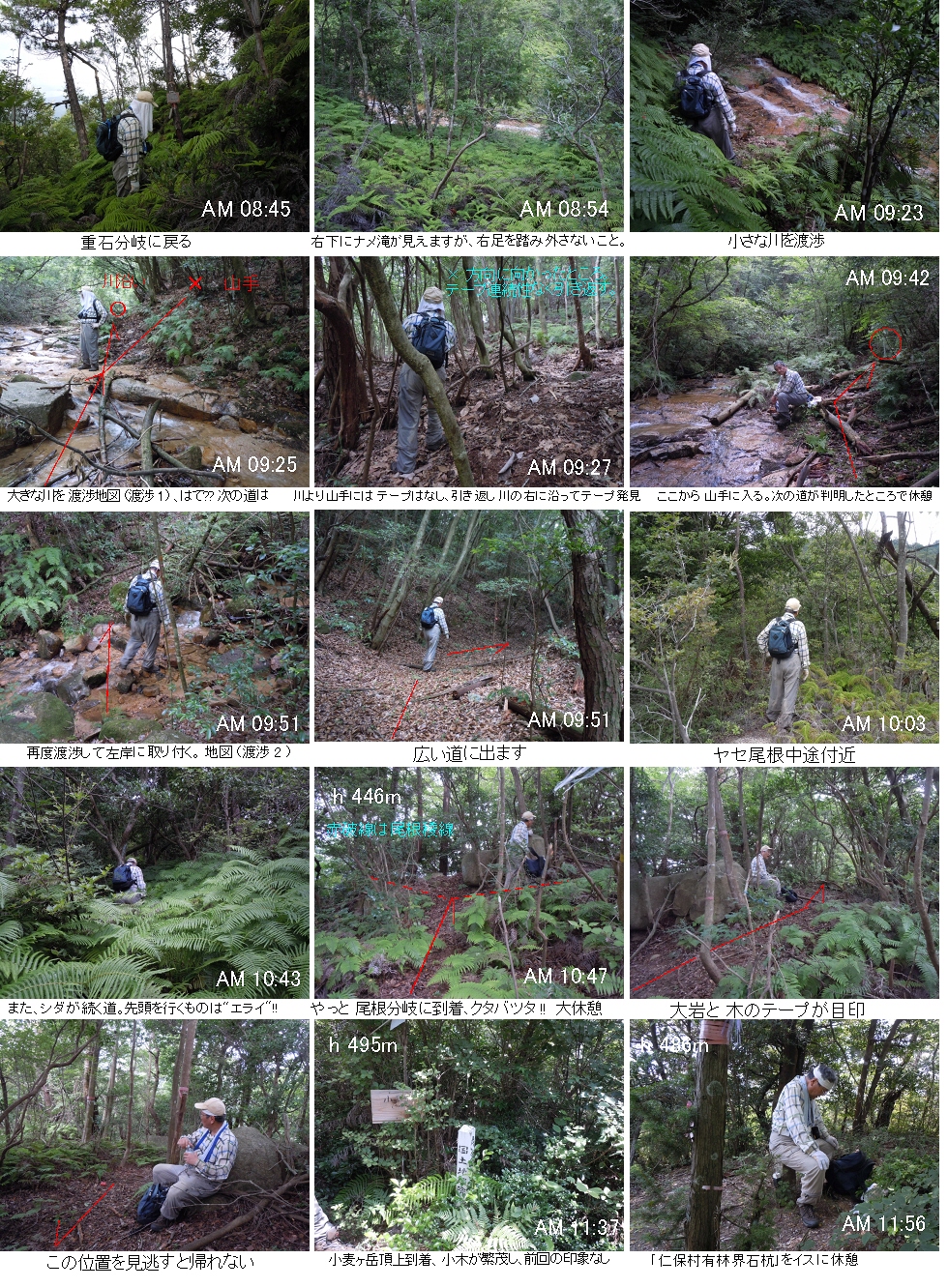 ■駐車地→仁保重石コース→重石・滝 観覧→蕎麦ヶ岳 の教科書時間は 2時間30分 ですが 初登の方は悪路、不明道に悩まさられ、実際は3時間30分以上 かかリます。なを、3年前の尾根道(尾根取り付き→仁保村有林界石杭) との整備状況を現在と比較しますと、全く整備されてないのに残念でなりません。