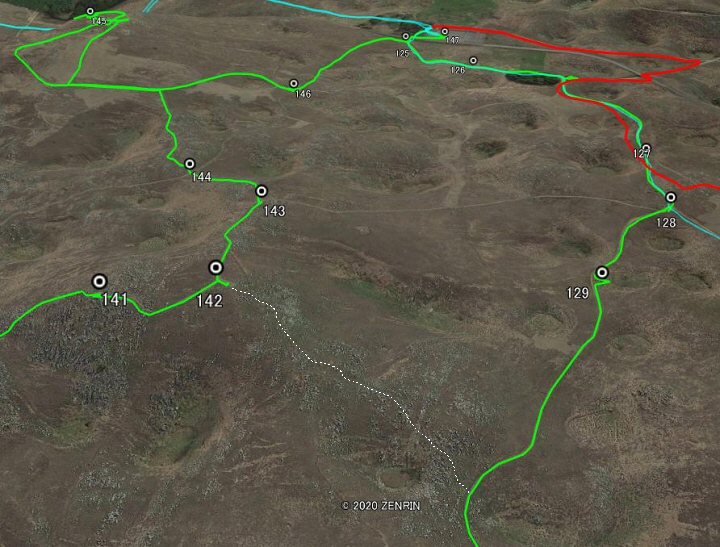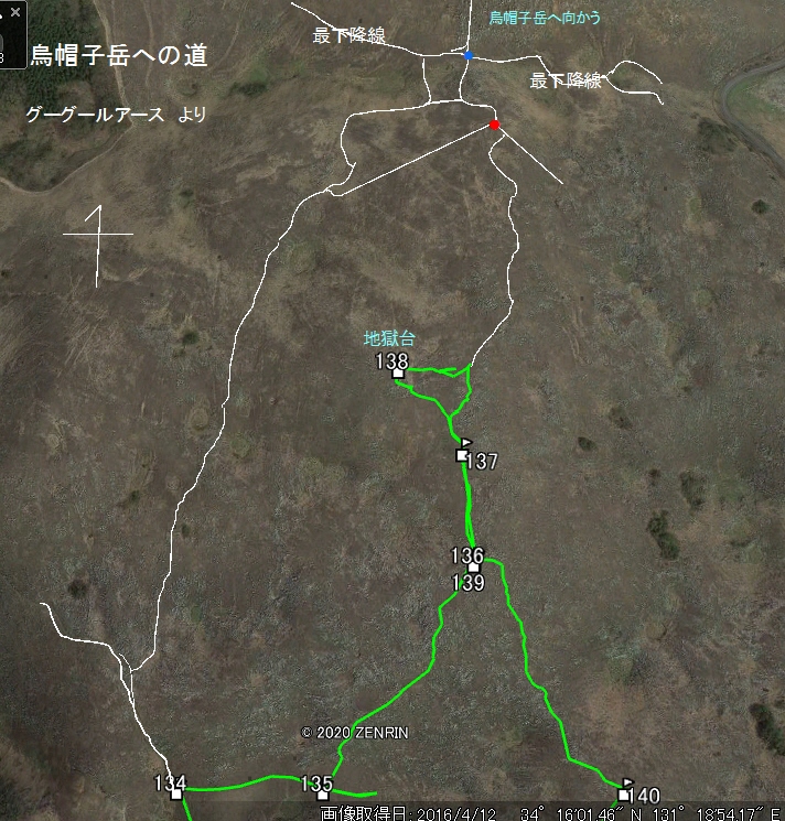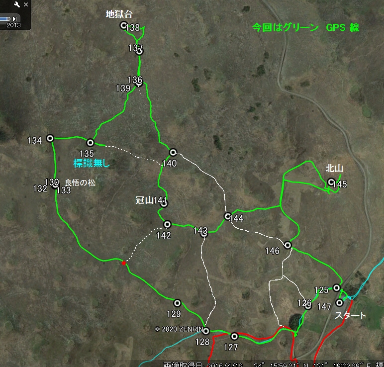 ■ 地点135から破線の道は未踏です。道は135地点から下っていますが、実際に少し先を歩行し、行く先を目視しました。確かに140地点方向へ続く道のように思われます。なお、行先の突き当りはピンクテープがありますが、標識は有りません。地獄台に行かずに冠山方面に行くのに便利な道です。